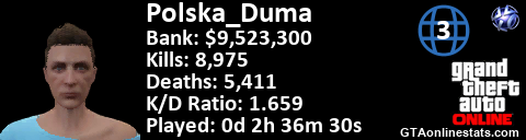 <a href="http://GTAonlinestats.com/showplayer/Polska_Duma/4"><img src="http://GTAonlinestats.com/signature/Polska_Duma/4/sig.png" alt="Polska_Duma" border="0" /></a>
