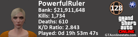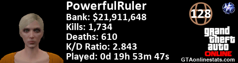 <a href="http://GTAonlinestats.com/showplayer/PowerfulRuler/2"><img src="http://GTAonlinestats.com/signature/PowerfulRuler/2/sig.png" alt="PowerfulRuler" border="0" /></a>