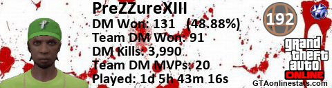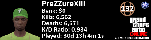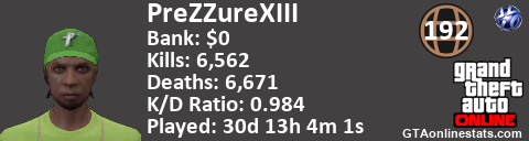 <a href="http://GTAonlinestats.com/showplayer/PreZZureXIII"><img src="http://GTAonlinestats.com/dmsignature/PreZZureXIII/sig.png" alt="PreZZureXIII" border="0" /></a>