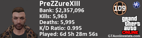 <a href="http://GTAonlinestats.com/showplayer/PreZZureXIII/2"><img src="http://GTAonlinestats.com/dmsignature/PreZZureXIII/2/sig.png" alt="PreZZureXIII" border="0" /></a>