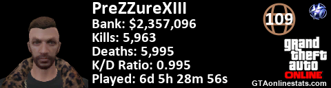 <a href="http://GTAonlinestats.com/showplayer/PreZZureXIII/2"><img src="http://GTAonlinestats.com/signature/PreZZureXIII/2/sig.png" alt="PreZZureXIII" border="0" /></a>