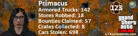 [URL=http://GTAonlinestats.com/showplayer/Primacus][IMG]http://GTAonlinestats.com/crimesignature/Primacus/sig.png[/IMG][/URL]