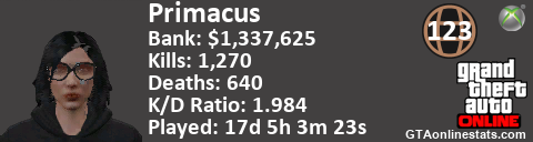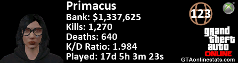 <a href="http://GTAonlinestats.com/showplayer/Primacus"><img src="http://GTAonlinestats.com/signature/Primacus/sig.png" alt="Primacus" border="0" /></a>