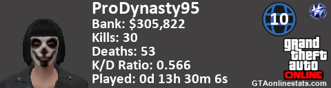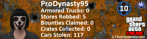 [URL=http://GTAonlinestats.com/showplayer/ProDynasty95/3][IMG]http://GTAonlinestats.com/crimesignature/ProDynasty95/3/sig.png[/IMG][/URL]