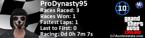 [URL=http://GTAonlinestats.com/showplayer/ProDynasty95/3][IMG]http://GTAonlinestats.com/racesignature/ProDynasty95/3/sig.png[/IMG][/URL]