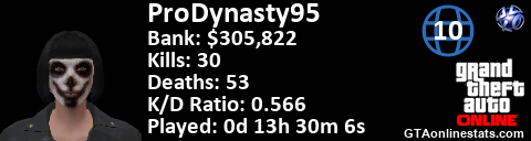 <a href="http://GTAonlinestats.com/showplayer/ProDynasty95/3"><img src="http://GTAonlinestats.com/signature/ProDynasty95/3/sig.png" alt="ProDynasty95" border="0" /></a>