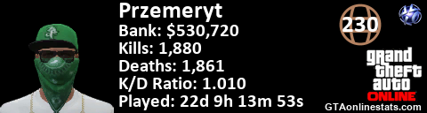 [URL=http://GTAonlinestats.com/showplayer/Przemeryt][IMG]http://GTAonlinestats.com/signature/Przemeryt/sig.png[/IMG][/URL]