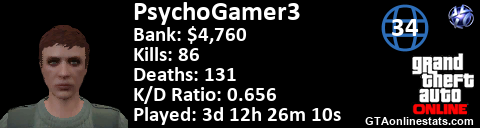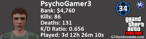 <a href="http://GTAonlinestats.com/showplayer/PsychoGamer3"><img src="http://GTAonlinestats.com/dmsignature/PsychoGamer3/sig.png" alt="PsychoGamer3" border="0" /></a>