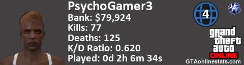 <a href="http://GTAonlinestats.com/showplayer/PsychoGamer3/2"><img src="http://GTAonlinestats.com/dmsignature/PsychoGamer3/2/sig.png" alt="PsychoGamer3" border="0" /></a>