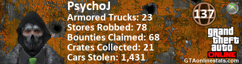 [URL=http://GTAonlinestats.com/showplayer/PsychoJ][IMG]http://GTAonlinestats.com/crimesignature/PsychoJ/sig.png[/IMG][/URL]