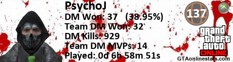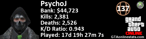 [URL=http://GTAonlinestats.com/showplayer/PsychoJ][IMG]http://GTAonlinestats.com/dmsignature/PsychoJ/sig.png[/IMG][/URL]
