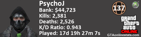 <a href="http://GTAonlinestats.com/showplayer/PsychoJ"><img src="http://GTAonlinestats.com/signature/PsychoJ/sig.png" alt="PsychoJ" border="0" /></a>