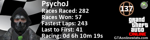 [URL=http://GTAonlinestats.com/showplayer/PsychoJ][IMG]http://GTAonlinestats.com/racesignature/PsychoJ/sig.png[/IMG][/URL]