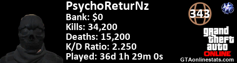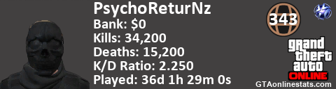 [URL=http://GTAonlinestats.com/showplayer/PsychoReturNz][IMG]http://GTAonlinestats.com/greysignature/PsychoReturNz/sig.png[/IMG][/URL]