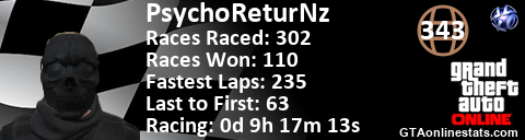 <a href="http://GTAonlinestats.com/showplayer/PsychoReturNz"><img src="http://GTAonlinestats.com/racesignature/PsychoReturNz/sig.png" alt="PsychoReturNz" border="0" /></a>