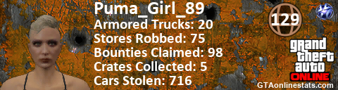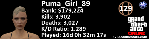[URL=http://GTAonlinestats.com/showplayer/Puma_Girl_89][IMG]http://GTAonlinestats.com/randomsignature/Puma_Girl_89/sig.png[/IMG][/URL]