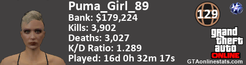 <a href="http://GTAonlinestats.com/showplayer/Puma_Girl_89"><img src="http://GTAonlinestats.com/greysignature/Puma_Girl_89/sig.png" alt="Puma_Girl_89" border="0" /></a>