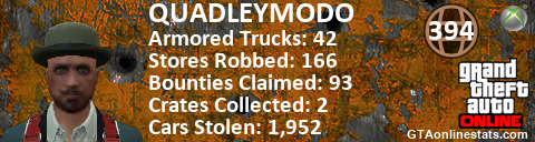 <a href="http://GTAonlinestats.com/showplayer/QUADLEYMODO"><img src="http://GTAonlinestats.com/signature/QUADLEYMODO/sig.png" alt="QUADLEYMODO" border="0" /></a>