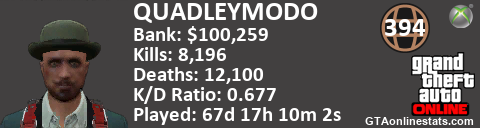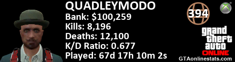 <a href="http://GTAonlinestats.com/showplayer/QUADLEYMODO"><img src="http://GTAonlinestats.com/dmsignature/QUADLEYMODO/sig.png" alt="QUADLEYMODO" border="0" /></a>
