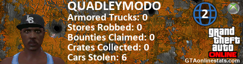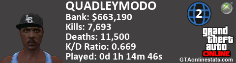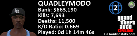 [URL=http://GTAonlinestats.com/showplayer/QUADLEYMODO/2][IMG]http://GTAonlinestats.com/greysignature/QUADLEYMODO/2/sig.png[/IMG][/URL]