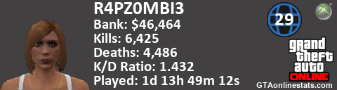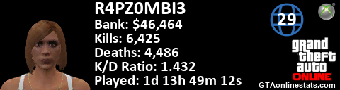 <a href="http://GTAonlinestats.com/showplayer/R4PZ0MBI3/2"><img src="http://GTAonlinestats.com/dmsignature/R4PZ0MBI3/2/sig.png" alt="R4PZ0MBI3" border="0" /></a>