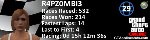 <a href="http://GTAonlinestats.com/showplayer/R4PZ0MBI3/2"><img src="http://GTAonlinestats.com/racesignature/R4PZ0MBI3/2/sig.png" alt="R4PZ0MBI3" border="0" /></a>