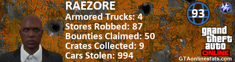 [URL=http://GTAonlinestats.com/showplayer/RAEZORE][IMG]http://GTAonlinestats.com/randomsignature/RAEZORE/sig.png[/IMG][/URL]