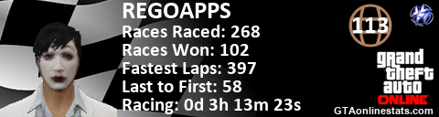 [URL=http://GTAonlinestats.com/showplayer/REGOAPPS][IMG]http://GTAonlinestats.com/racesignature/REGOAPPS/sig.png[/IMG][/URL]