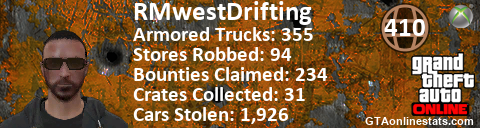 <a href="http://GTAonlinestats.com/showplayer/RMwestDrifting"><img src="http://GTAonlinestats.com/signature/RMwestDrifting/sig.png" alt="RMWestDrifting" border="0" /></a>