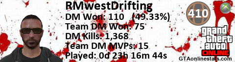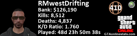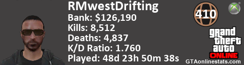 <a href="http://GTAonlinestats.com/showplayer/RMwestDrifting"><img src="http://GTAonlinestats.com/dmsignature/RMwestDrifting/sig.png" alt="RMWestDrifting" border="0" /></a>