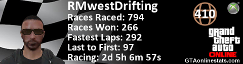 [URL=http://GTAonlinestats.com/showplayer/RMwestDrifting][IMG]http://GTAonlinestats.com/racesignature/RMwestDrifting/sig.png[/IMG][/URL]