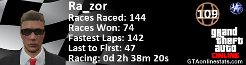 [URL=http://GTAonlinestats.com/showplayer/Ra_zor][IMG]http://GTAonlinestats.com/racesignature/Ra_zor/sig.png[/IMG][/URL]