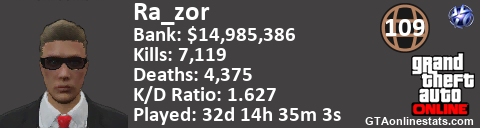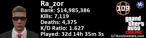 <a href="http://GTAonlinestats.com/showplayer/Ra_zor"><img src="http://GTAonlinestats.com/dmsignature/Ra_zor/sig.png" alt="Ra_zor" border="0" /></a>