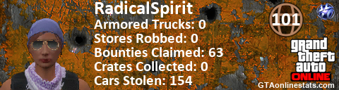 [URL=http://GTAonlinestats.com/showplayer/RadicalSpirit/2][IMG]http://GTAonlinestats.com/crimesignature/RadicalSpirit/2/sig.png[/IMG][/URL]