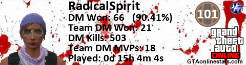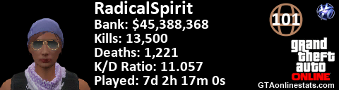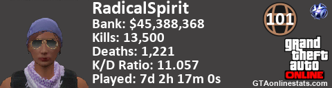 [URL=http://GTAonlinestats.com/showplayer/RadicalSpirit/2][IMG]http://GTAonlinestats.com/dmsignature/RadicalSpirit/2/sig.png[/IMG][/URL]