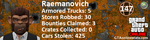 [URL=http://GTAonlinestats.com/showplayer/Raemanovich][IMG]http://GTAonlinestats.com/crimesignature/Raemanovich/sig.png[/IMG][/URL]