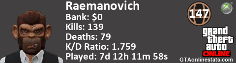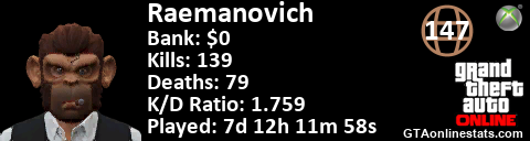[URL=http://GTAonlinestats.com/showplayer/Raemanovich][IMG]http://GTAonlinestats.com/randomsignature/Raemanovich/sig.png[/IMG][/URL]