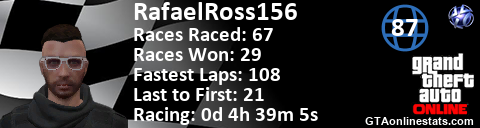 <a href="http://GTAonlinestats.com/showplayer/RafaelRoss156"><img src="http://GTAonlinestats.com/racesignature/RafaelRoss156/sig.png" alt="RafaelRoss156" border="0" /></a>