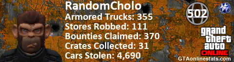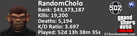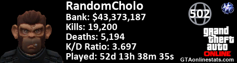 <a href="http://GTAonlinestats.com/showplayer/RandomCholo"><img src="http://GTAonlinestats.com/randomsignature/RandomCholo/sig.png" alt="RandomCholo" border="0" /></a>