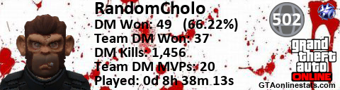 [URL=http://GTAonlinestats.com/showplayer/RandomCholo][IMG]http://GTAonlinestats.com/dmsignature/RandomCholo/sig.png[/IMG][/URL]