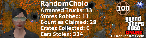 [URL=http://GTAonlinestats.com/showplayer/RandomCholo/2][IMG]http://GTAonlinestats.com/signature/RandomCholo/2/sig.png[/IMG][/URL]