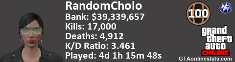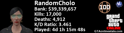 <a href="http://GTAonlinestats.com/showplayer/RandomCholo/2"><img src="http://GTAonlinestats.com/greysignature/RandomCholo/2/sig.png" alt="RandomCholo" border="0" /></a>