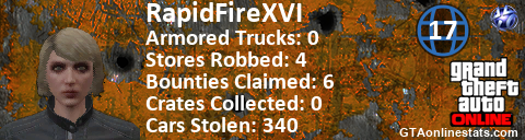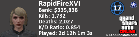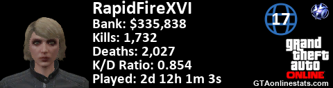 <a href="http://GTAonlinestats.com/showplayer/RapidFireXVI"><img src="http://GTAonlinestats.com/signature/RapidFireXVI/sig.png" alt="RapidFireXVI" border="0" /></a>