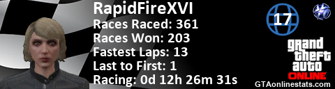 <a href="http://GTAonlinestats.com/showplayer/RapidFireXVI"><img src="http://GTAonlinestats.com/racesignature/RapidFireXVI/sig.png" alt="RapidFireXVI" border="0" /></a>