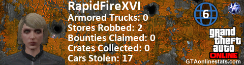 [URL=http://GTAonlinestats.com/showplayer/RapidFireXVI/3][IMG]http://GTAonlinestats.com/crimesignature/RapidFireXVI/3/sig.png[/IMG][/URL]