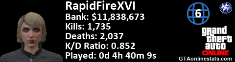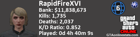 [URL=http://GTAonlinestats.com/showplayer/RapidFireXVI/3][IMG]http://GTAonlinestats.com/signature/RapidFireXVI/3/sig.png[/IMG][/URL]