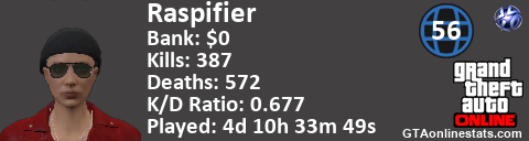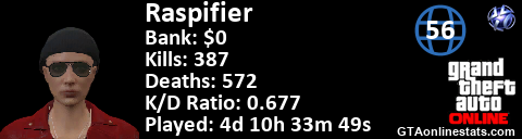[URL=http://GTAonlinestats.com/showplayer/Raspifier][IMG]http://GTAonlinestats.com/signature/Raspifier/sig.png[/IMG][/URL]