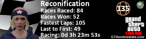 [URL=http://GTAonlinestats.com/showplayer/Reconification][IMG]http://GTAonlinestats.com/racesignature/Reconification/sig.png[/IMG][/URL]