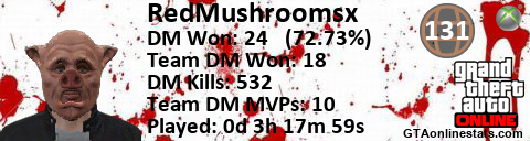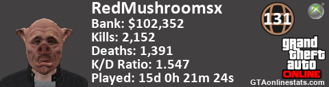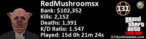 <a href="http://GTAonlinestats.com/showplayer/RedMushroomsx"><img src="http://GTAonlinestats.com/dmsignature/RedMushroomsx/sig.png" alt="RedMushroomsx" border="0" /></a>
