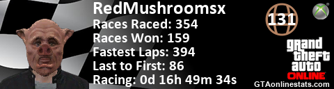 [URL=http://GTAonlinestats.com/showplayer/RedMushroomsx][IMG]http://GTAonlinestats.com/racesignature/RedMushroomsx/sig.png[/IMG][/URL]